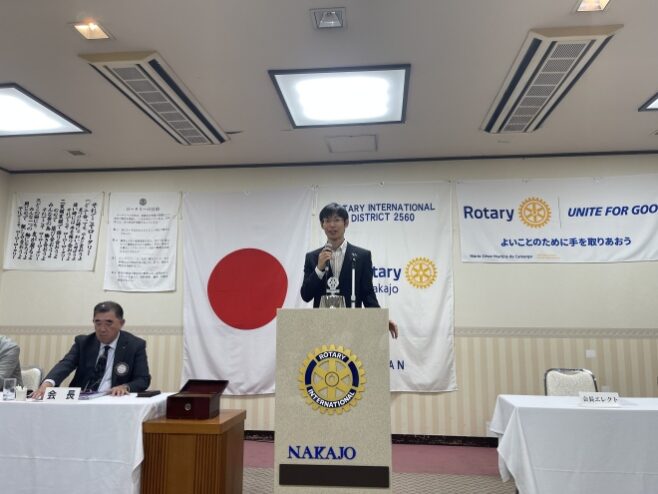 ・11月に入ると短い秋も終わりを迎え、いよいよ季節は冬へ向かいます。職業奉仕の活動として、企業訪問を初め、外に出ての事業も予定しています。ぜひとも積極的に参加いただいて、会員相互の親睦の輪をさらに広げていきましょう。後ほど新入会員となる鍋島さんの入会式を行います。新入会員の紹介は推薦者の髙橋学さんにお願いいたします。