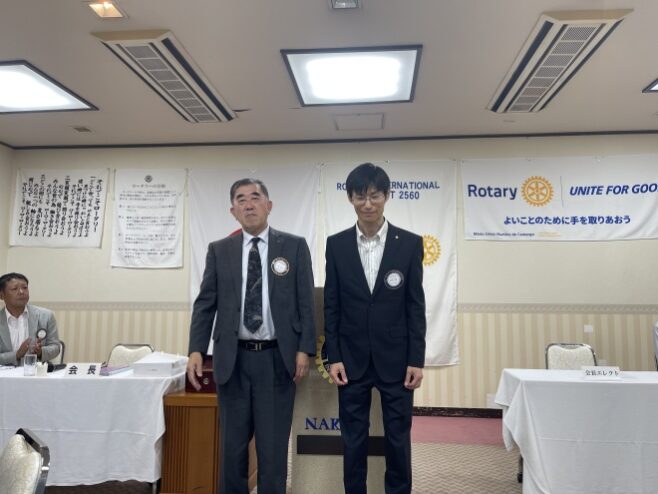 〇入会式(小野和英会長→鍋島丈敏さん)ロータリーバッジ授与、他