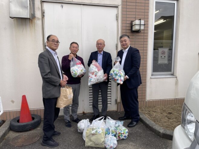 ・10月22日例会終了後、会員の皆さまの協力で収集したペットボトルキャップを胎内市社会福祉協議会に寄付してきました。