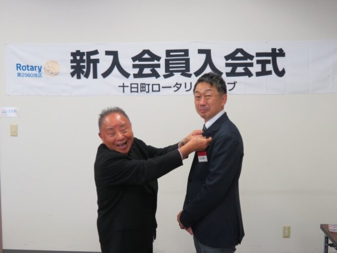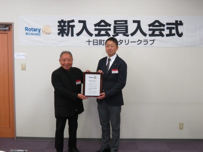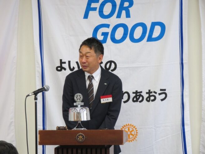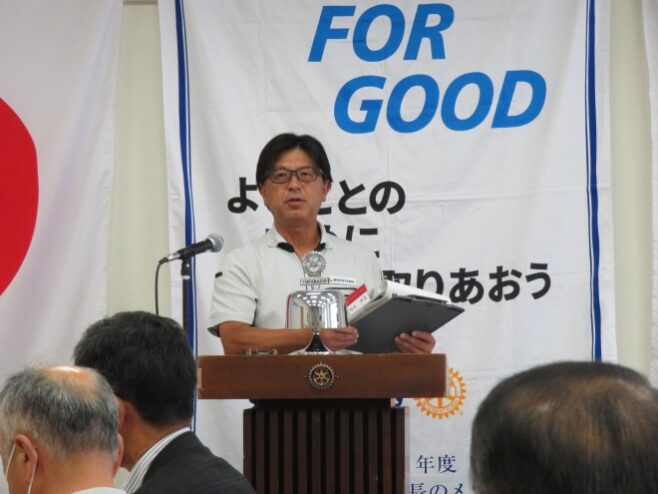 例会は、藤田会長より会長スピーチ、出席報告、理事会報告、そして、幹事報告、ニコニコボックス報告がありました。その後、転勤のため退会される桑原君の代わりに入会される菊池新入会員のご紹介、桑原君の挨拶と続きました。
