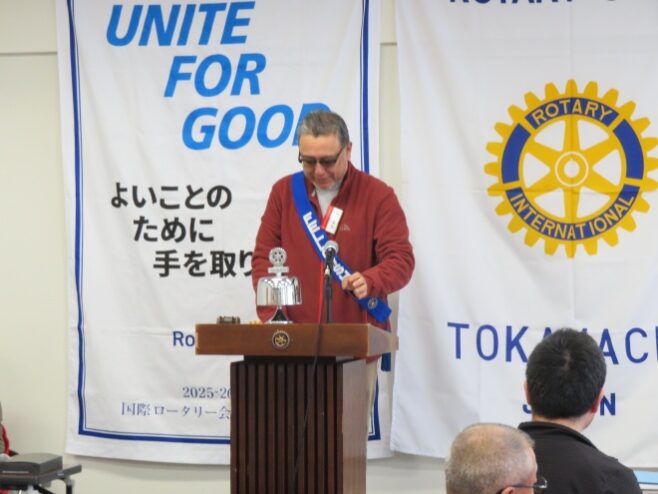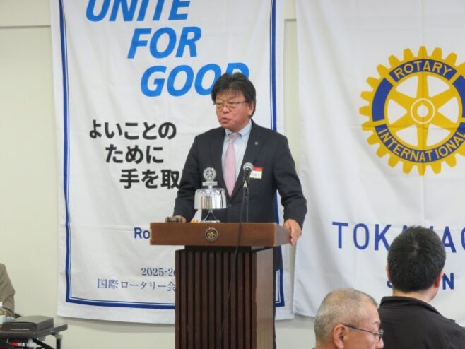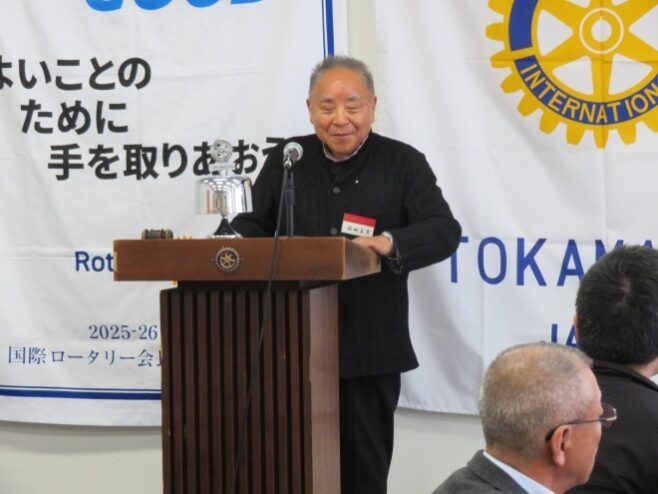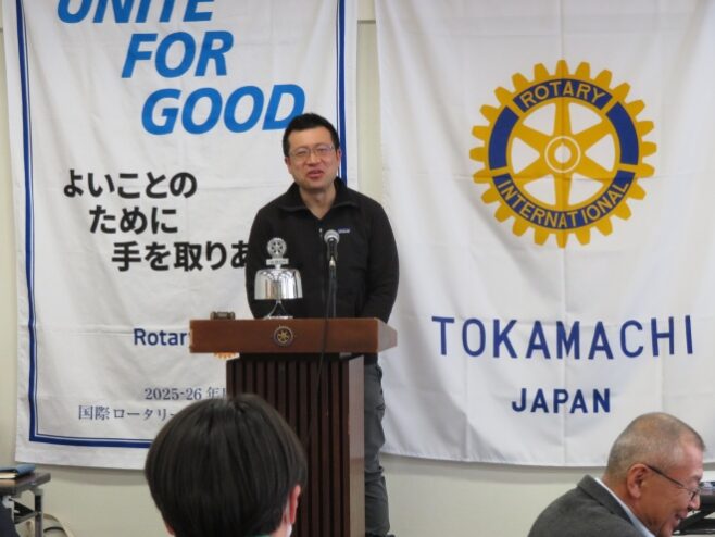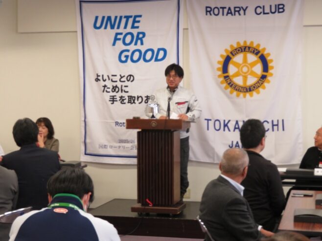 例会は、藤田会長よりスピーチ、幹事報告、出席報告、ニコニコボックス報告に続き、福崎君より6月に行われるRI国際大会についてのお知らせがありました。