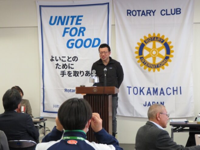 お食事の後は、外部卓話ということで、プログラム委員長の関谷君からご紹介をいただいたあと、地域おこし協力隊の小山様より卓話をしていただきました。